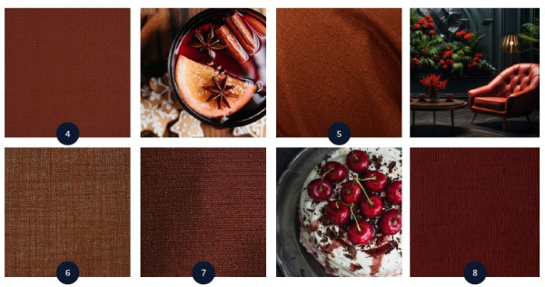 1: James Dunlop Allium Marsala, 2: James Dunlop Trailblazer Cherry, 3: James Dunlop Carter Spice, 4: Mokum Como Marsala, 5: James Dunlop Alpine Cherrywood, 6: James Dunlop Taffy Burgundy, 7: James Dunlop Element Terracotta, 8: James Dunlop Trail Merlot