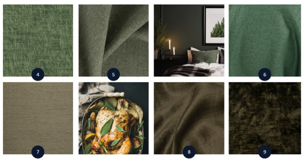 1: Mokum Eternal Eucalyptus, 2: James Dunlop Panier Emerald, 3: Zepel Bolt Pine, 4: James Dunlop Earthwild Pesto, 5: Zepel Calvary Pine, 6: James Dunlop Frisco Ivy, 7: James Dunlop Maharaja Sage, 8: Mokum Satnin Martini, 9: Mokum Bespoke Martini