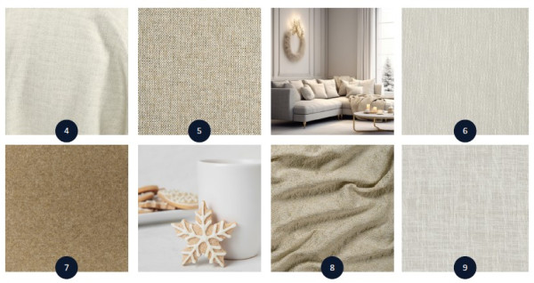 1: James Dunlop Luxe Champagne, 2: James Dunlop Vienna Champagne, 3: Mokum Grand Boucle Champagne, 4: James Dunlop Frisco Cream, 5: FR-One Supra Biscuit, 6: Mokum Makai White Gold, 7: James Dunlop Indent Nature Biscuit, 8: Mokum Metallique White Gold, 9: James Dunlop Earthwild Cream